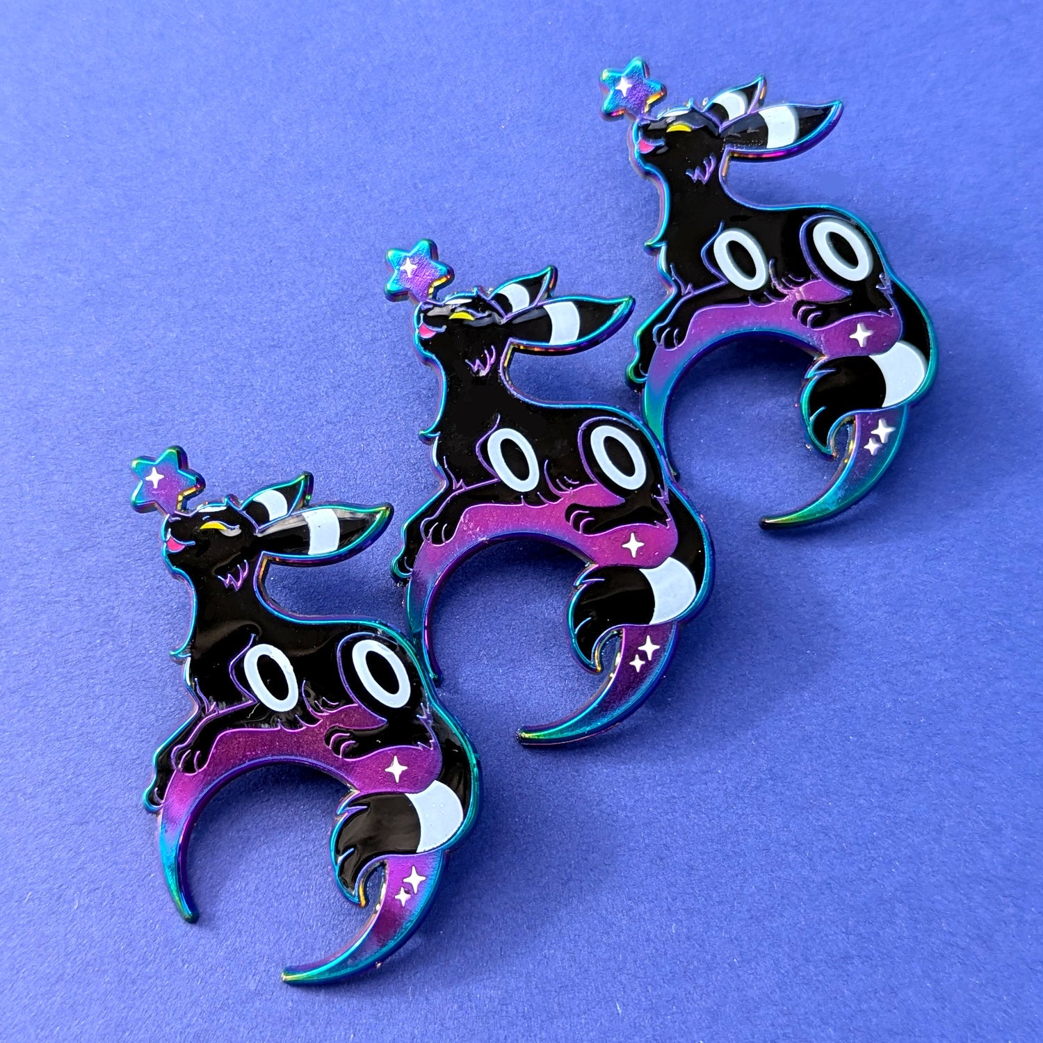 Measuring 60mm height, this hard enamel pin comes in two colourways, either gold, blue or rainbow chrome metal.