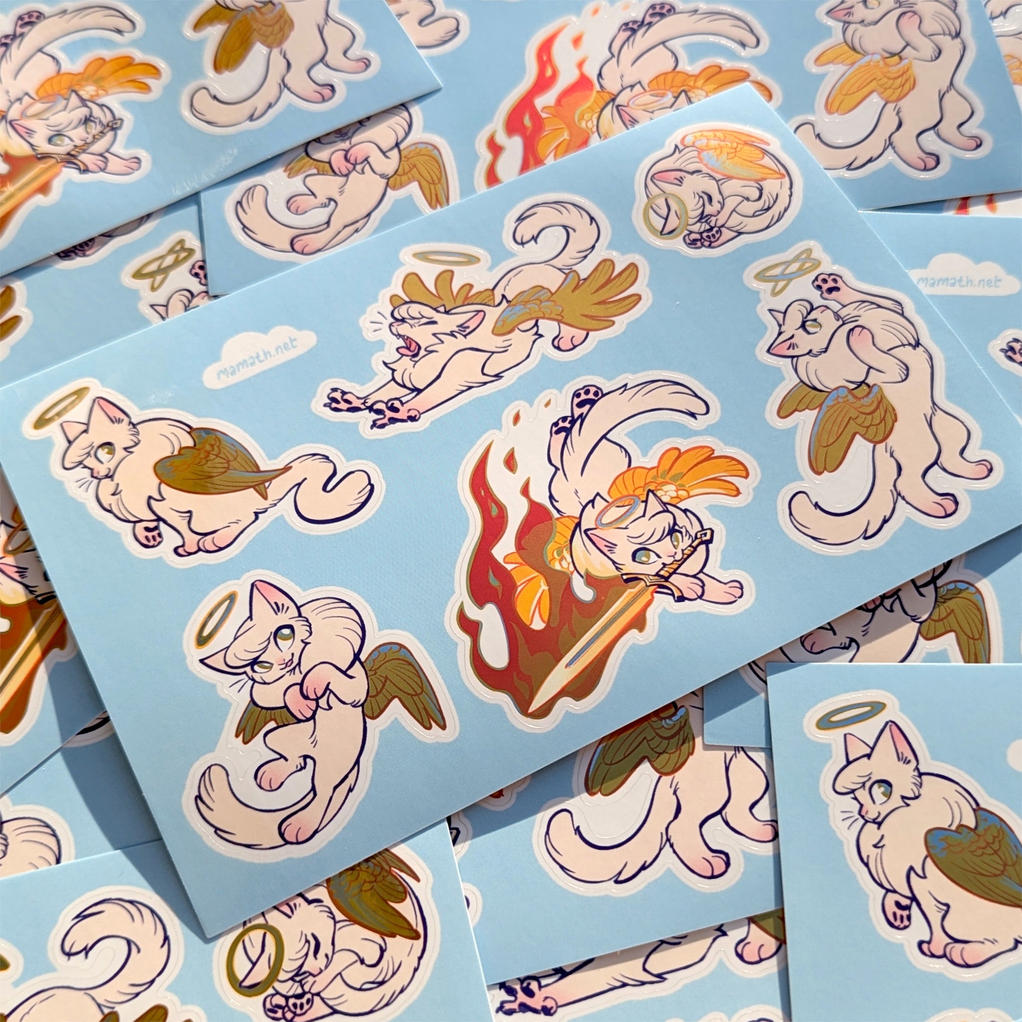 Each of these vinyl sticker sheets measures 4x6 inches with six kiss cut kitty stickers measuring around 1.5-2 inches. Printed on chrome vinyl with spot effects so that certain elements such as the golden wings and divine fire have a metallic sheen! The sturdy weatherproof gloss laminated vinyl will hold up to years of outdoor use / heavy handling too! Great for phones, handheld consoles, vehicles, etc.