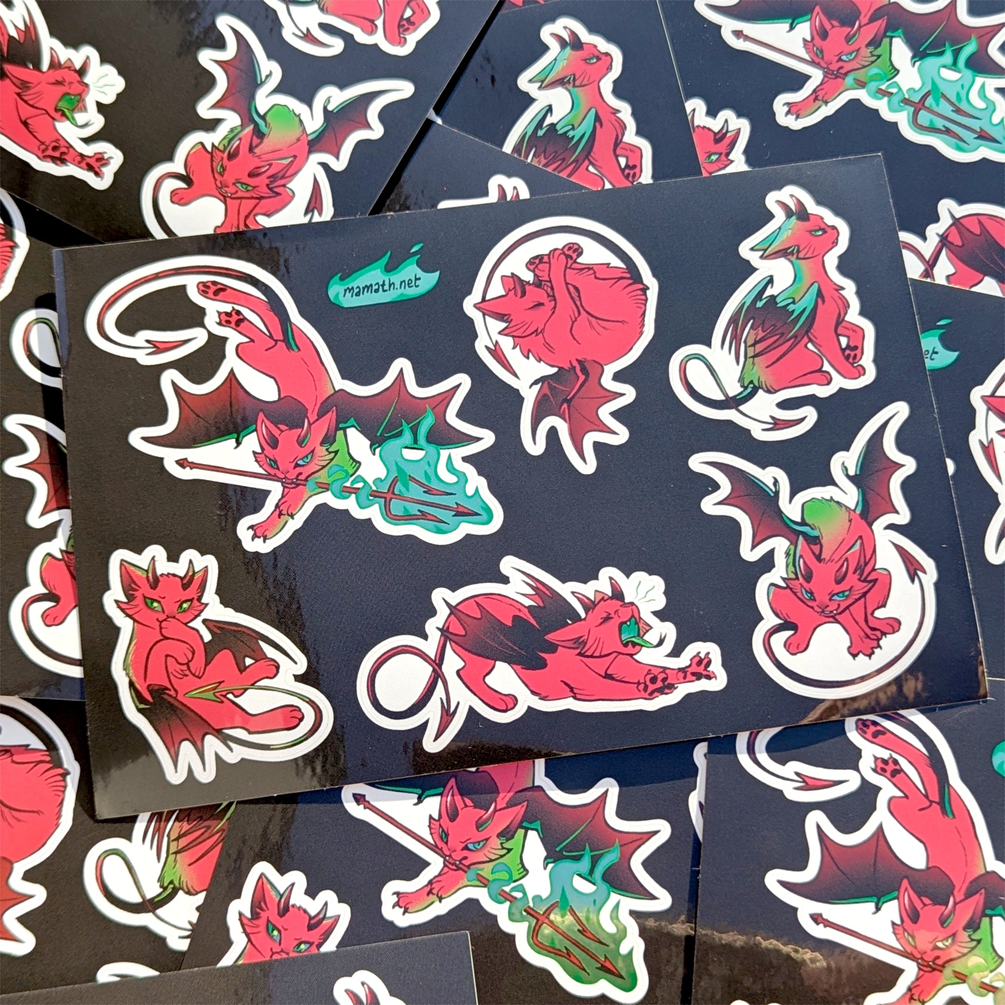 Each of these vinyl sticker sheets measures 4x6 inches with six kiss cut kitty stickers measuring around 1.5-2 inches. They are printed on chrome silver vinyl with spot effects so that certain elements like the fire and eyes have a metallic sheen! The sturdy weatherproof gloss laminated vinyl will hold up to years of outdoor use / heavy handling too! Great for phones, handheld consoles, vehicles, etc.