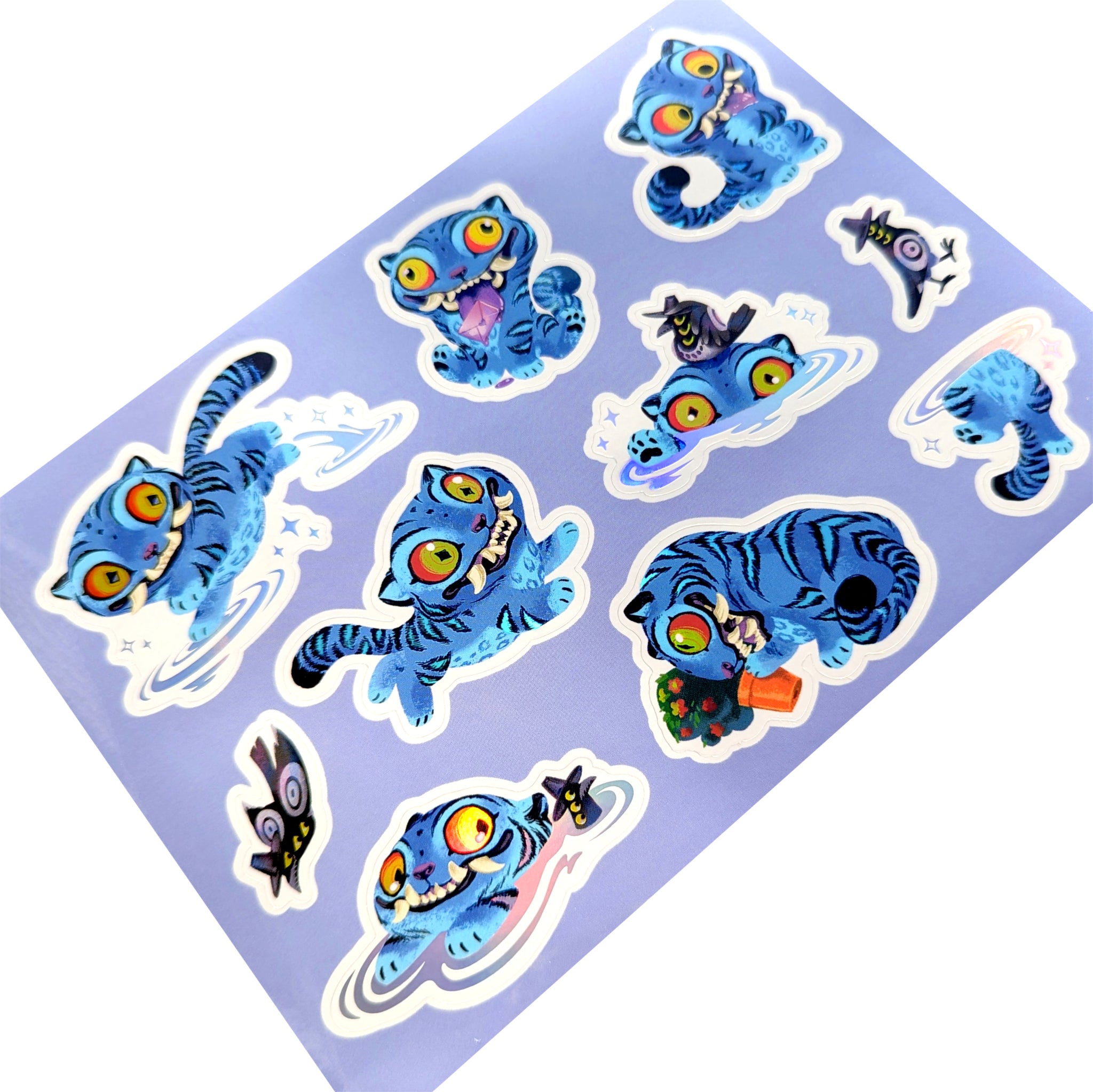 These stickers are printed on holographic vinyl so that certain parts are reflective (for example, the tiger's eyes and stripes). The whole sheet measures 5x7 inches and the individual stickers are mostly around 2 inches long, with the magpies being like an inch and the longest tiger sticker around 3 inches.