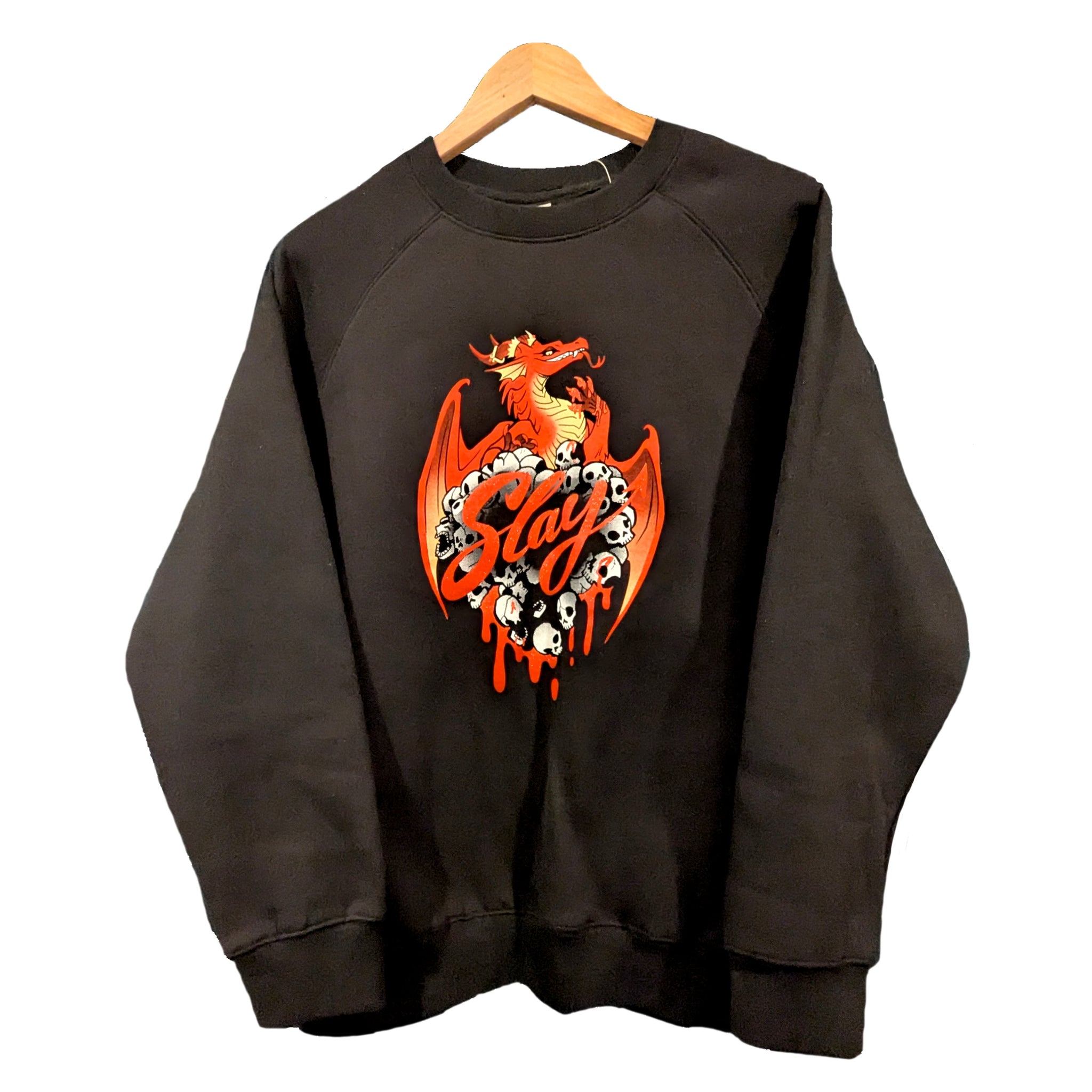 Absolutely decimate your enemies - AND stay warm and cozy! - in this fun and flirty screen-printed sweatshirt. Featuring a layer of crystallina gold glitter over the text and blood elements for that little extra zing!