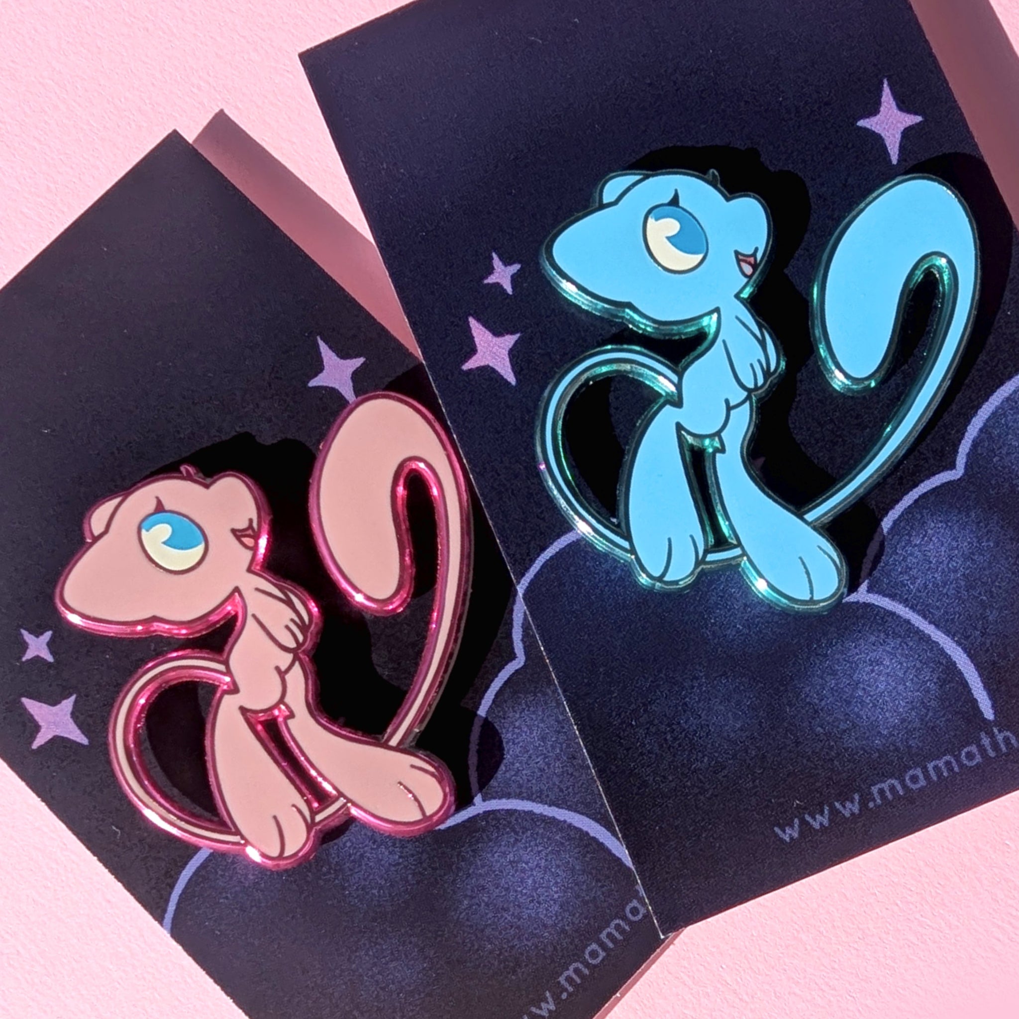 *FYI: These pins came in with a hugely disproportionate number of flawed pink chrome pins. Sadly ,that means only B-grades are available of the pink mew atm. Flaws are mostly bubbly or scraped off chrome plating on the back and sides so they look pretty good front on.